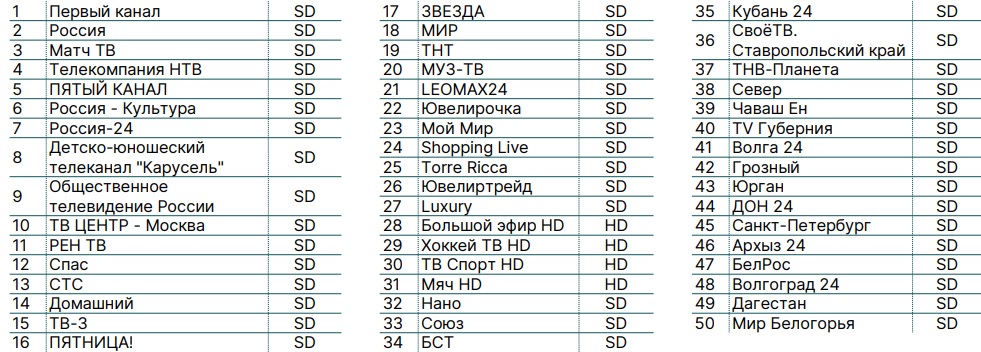 За абонентскую плату 2500 рублей в год Вы можете смотреть более 200 телеканалов, в том числе фильмовых, познавательных, развлекательных и музыкальных, из них 40 каналов высокой четкости Full HD (1920х1080). Немаловажным фактором является высокое положение спутника над горизонтом, что облегчает установку антенны в условиях многоэтажных построек и лесистой местности, и опять же делает это телевидение более доступным.
